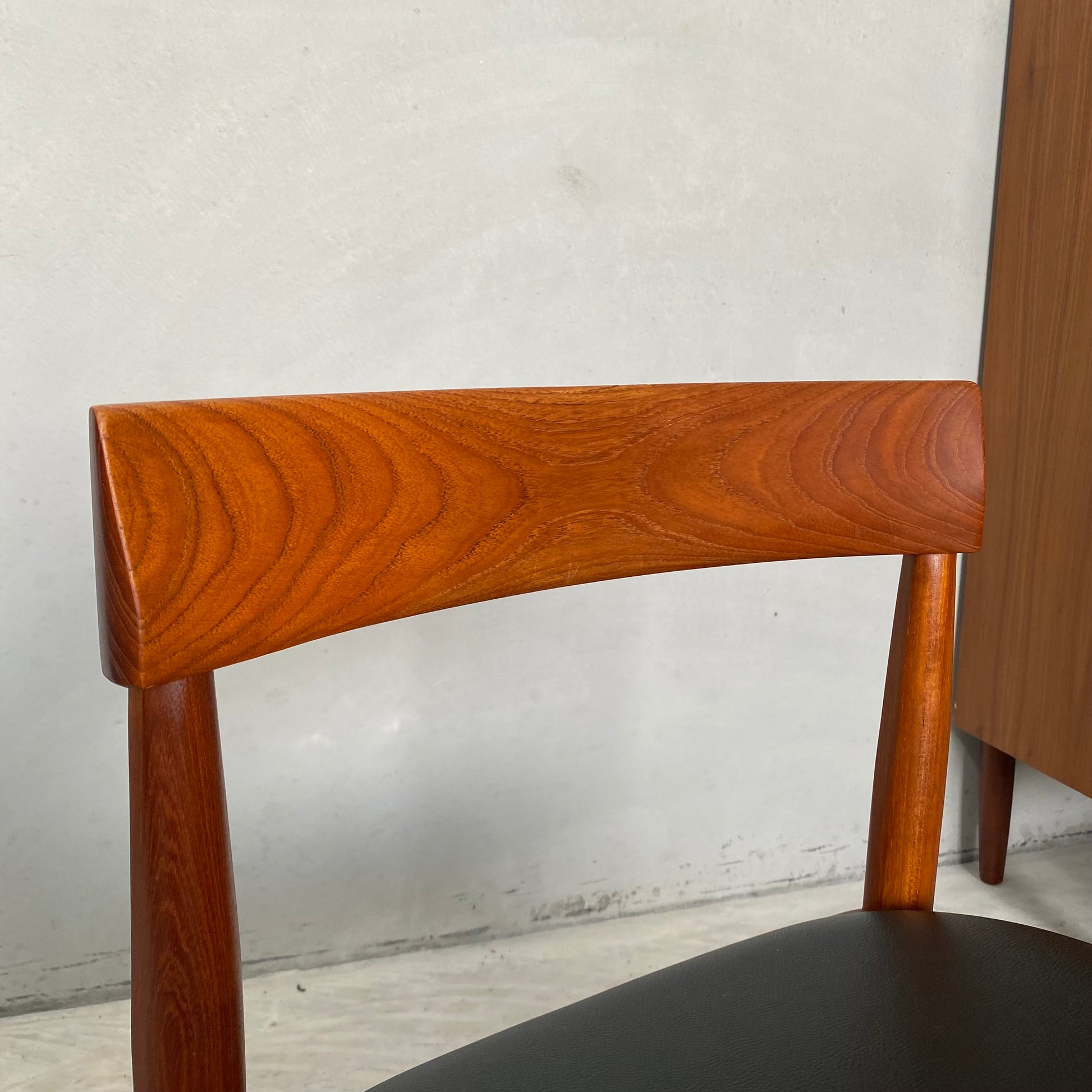 Featuring a solid teak frame with highly figured grain and black vinyl seats in great condition. Unfortunately somewhere in their lifetime the matching Ernst Hansen dining table has separated from the chairs. The chairs are designed to seamlessly tuck into the table, making for a neat and minimalistic dining setting. An example of this can be seen in the final photo. These chairs are a must-have for someone who already owns the table.