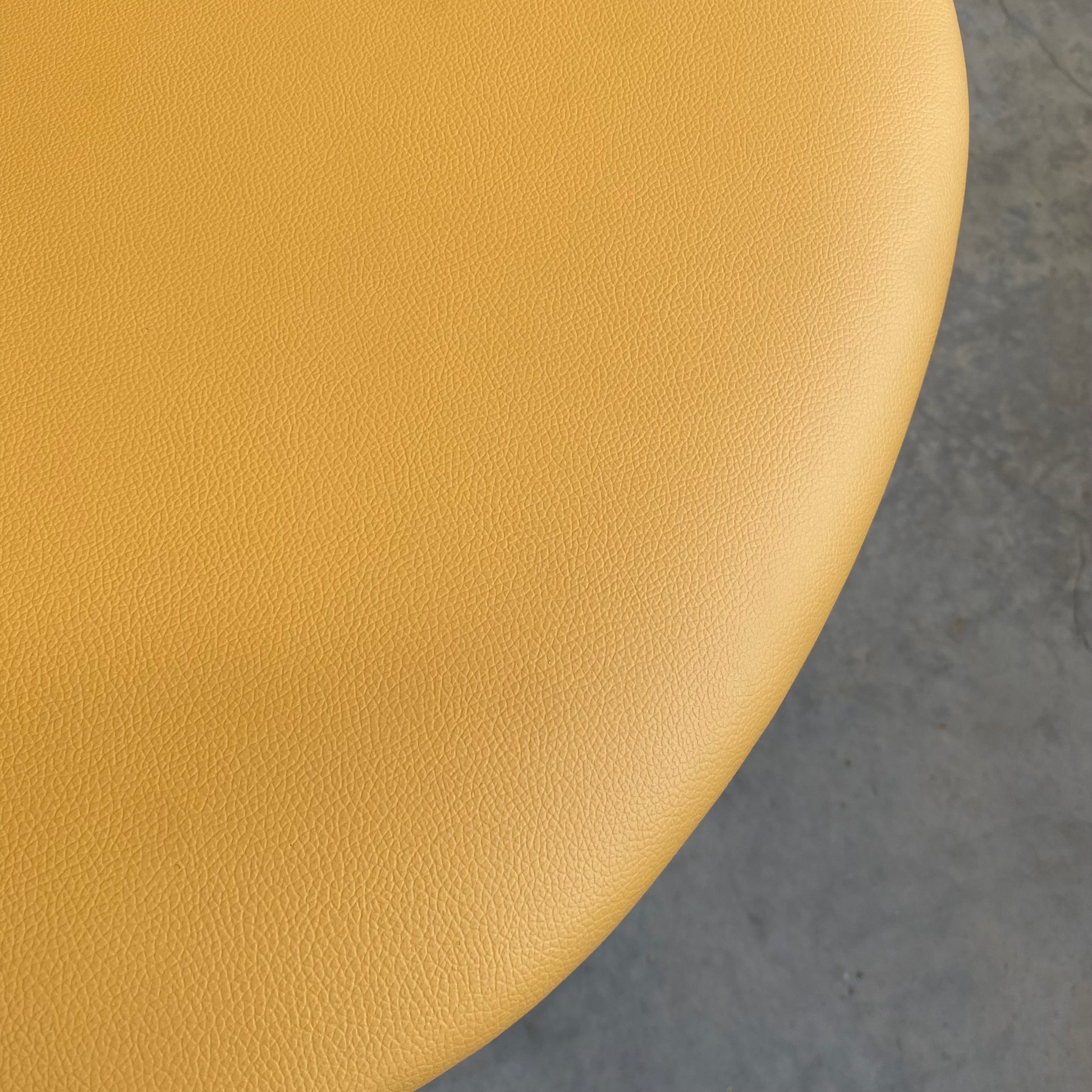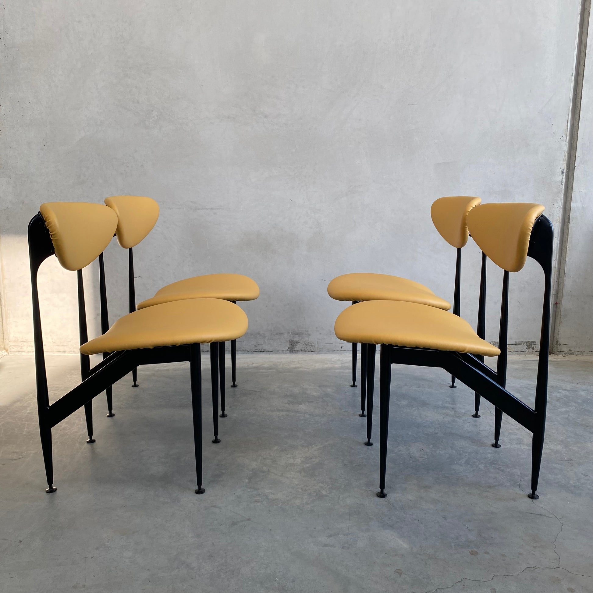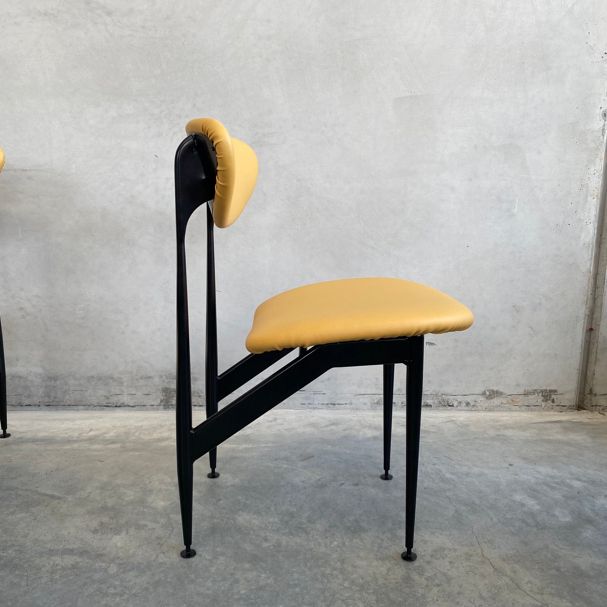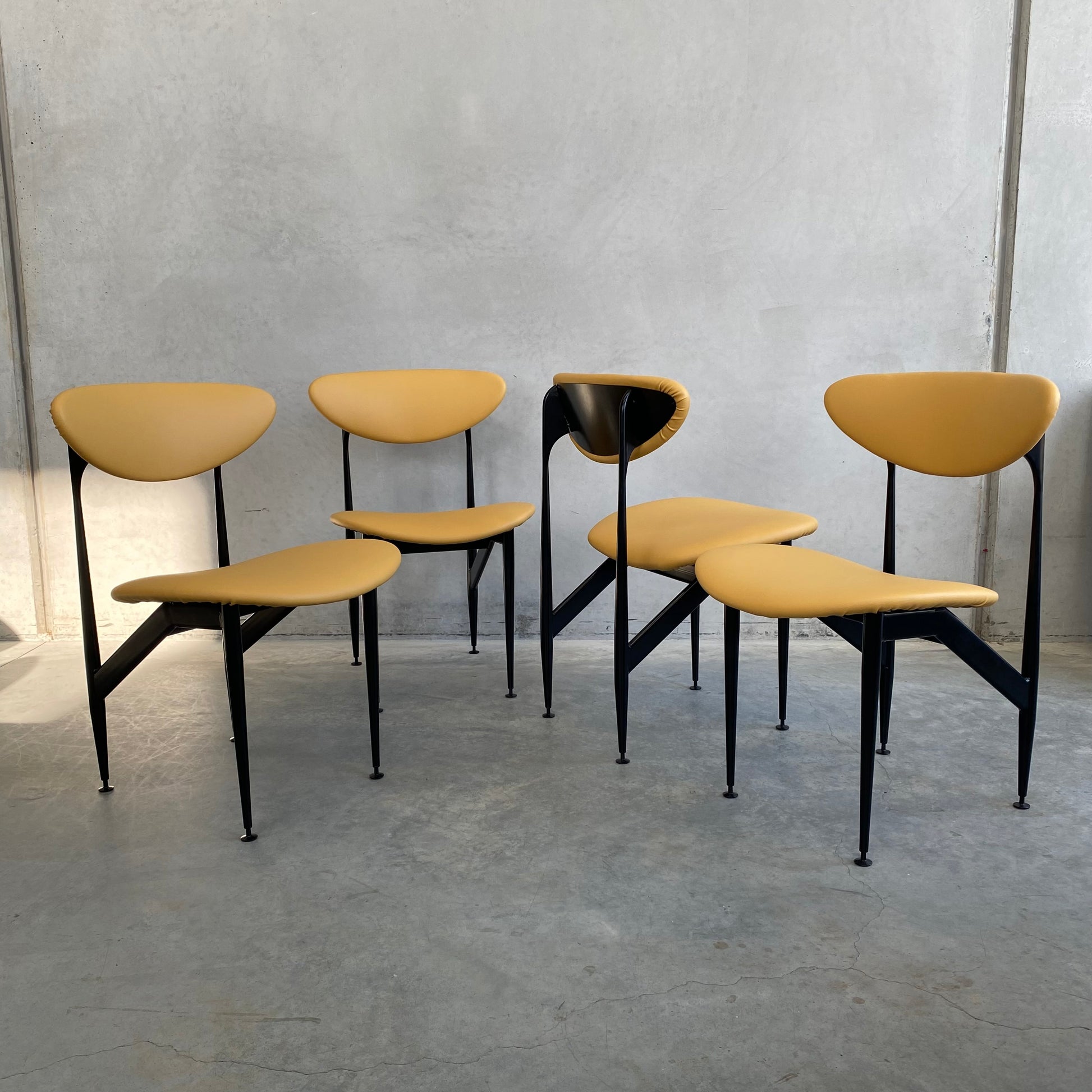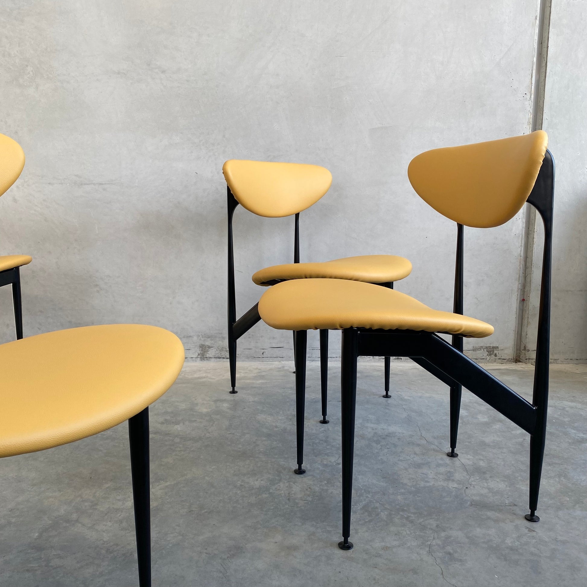 Fully restored, including all four frames being professionally sandblasted and powder coated in satin black, synonymous with the original finish. New seat foam on all four bases, including one of the bases being rebuilt. Brand new vinyl upholstery in ‘Lustrell Charisma Mustard’ by Warwick fabrics.