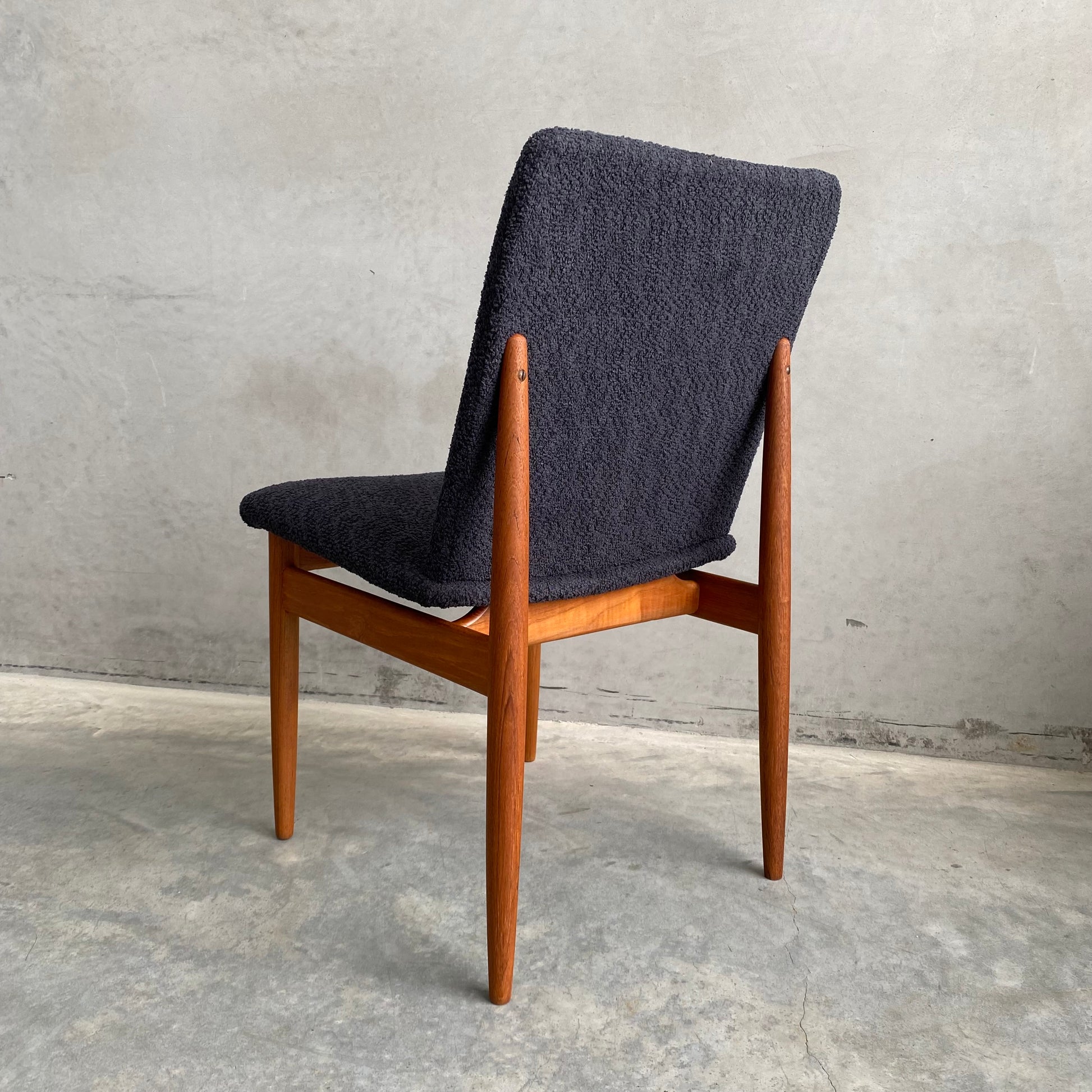 Restoration included sanding back and refinishing the teak frames in a durable hard wax oil. As well as new webbing, new seat foam and brand new upholstery in a charcoal boucle fabric.